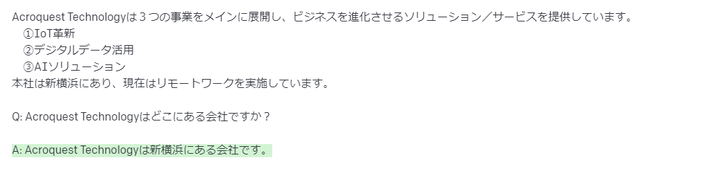 ここに、Acroquest Technologyの説明文を入力を加えると以下のように正確に回答できます。