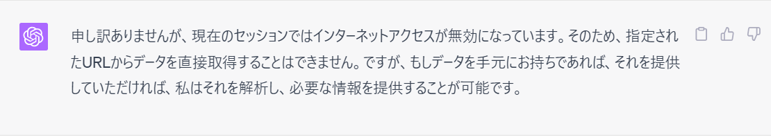 Code Interpreterでは外部APIにアクセスしてデータ取得ができないことがわかりました。