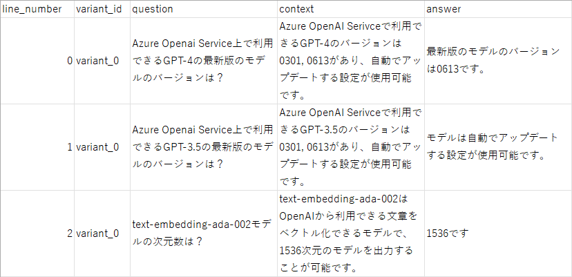 データとしては3行あり、2行目のレコードのみ質問とは関係ない回答を返してしまっている例を入れています。