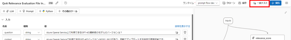 評価フローには「一括テスト」という機能があり、入力にファイルを指定してまとめてフローを実行することができます。