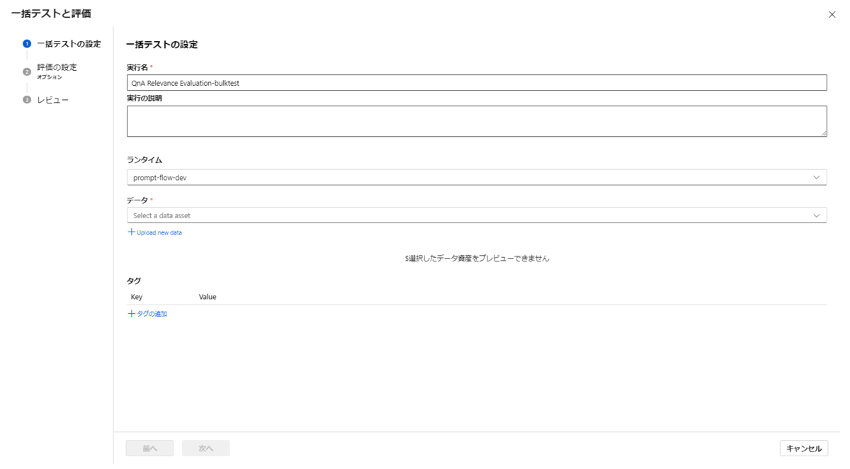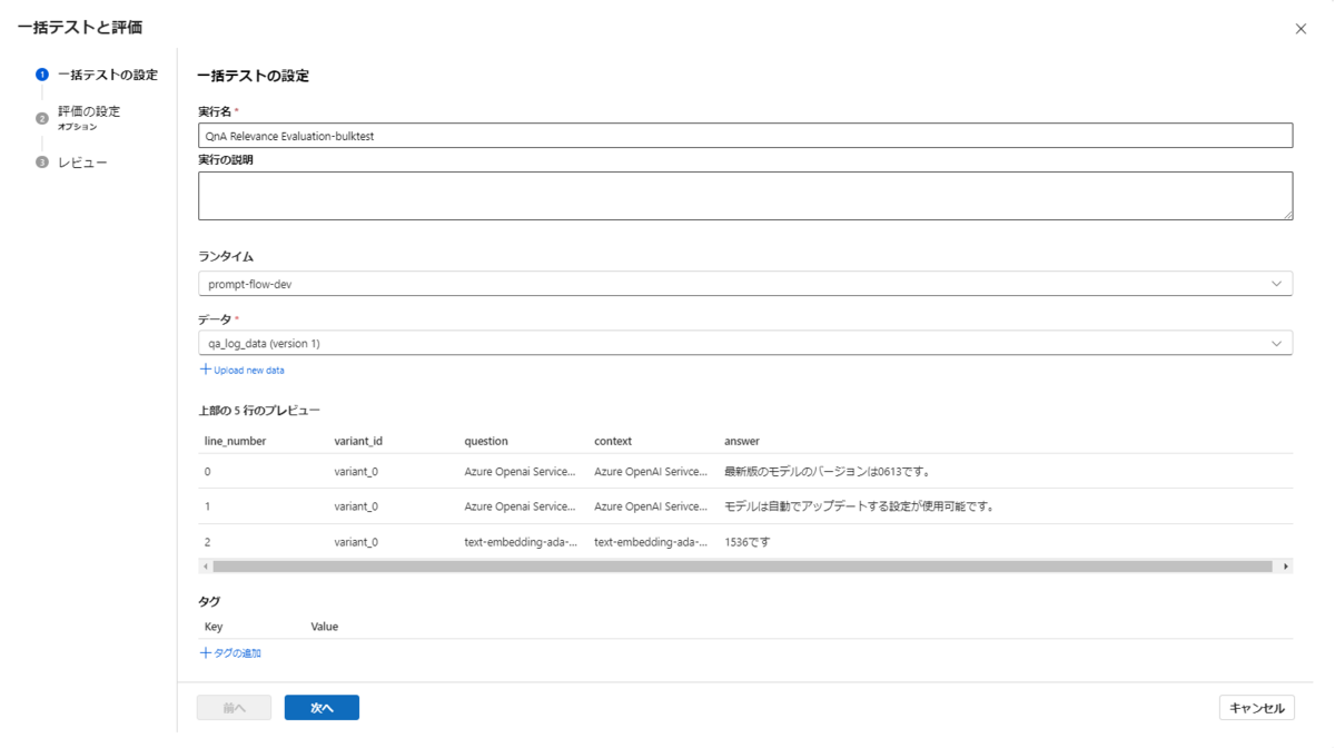 前回記事では、Azure Machine Learning Prompt Flowを使って手動で回答を評価することはできたので、今回はファイルから複数回答の自動評価を検証してみます。