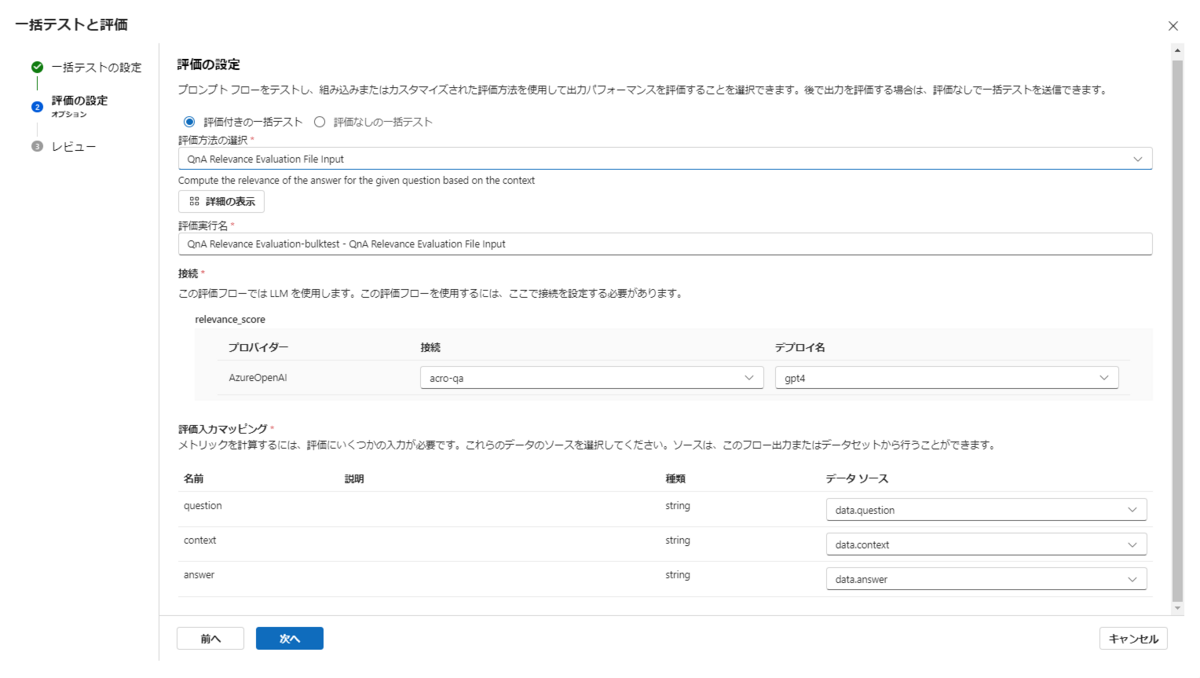 前回、手動で一つの回答について質問・コンテキスト・回答をもとに評価するフローを動かしてみました。