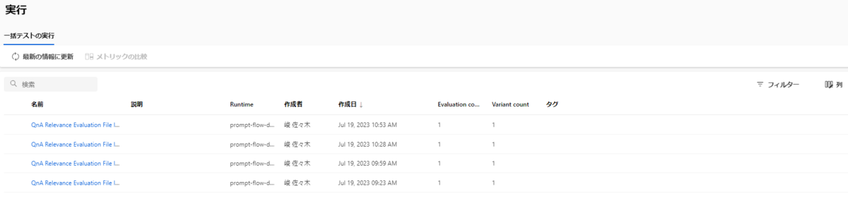 ここを選択すると一括テストの評価結果の一覧画面が表示され、各実行ごとの結果を閲覧することができます。