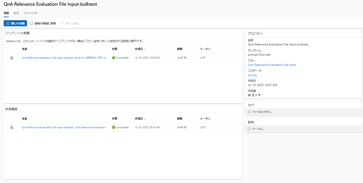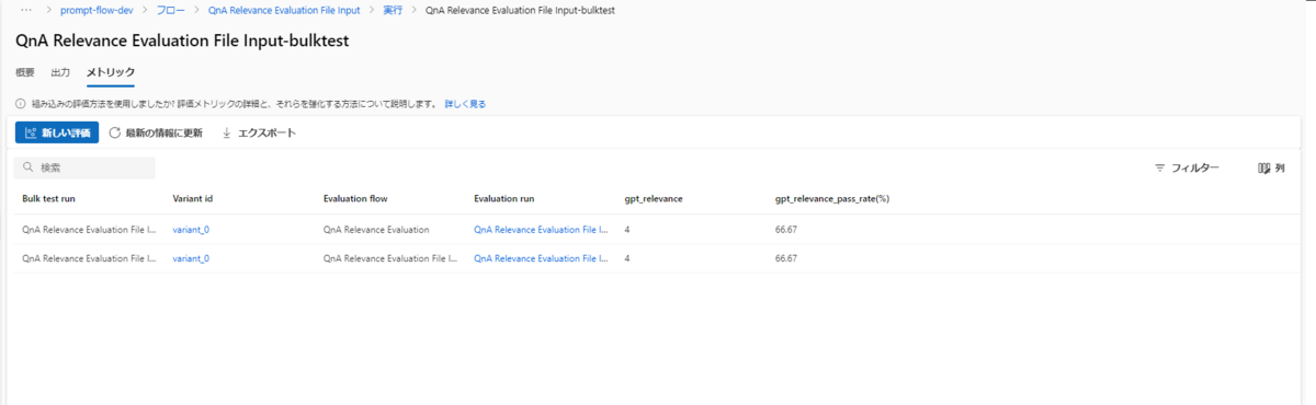 このようにPrompt Flowを使えば、会話履歴のファイルからフローを動かすだけで自動で評価結果を集計することができます。