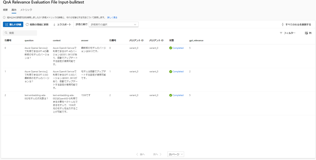 今回の集計結果としては、最高スコアの5が2つと、2が一つだけあり全体としてはgpt_relevance_pass_rate(%)が2/3で、よい結果が得られているという集計が確認できています。