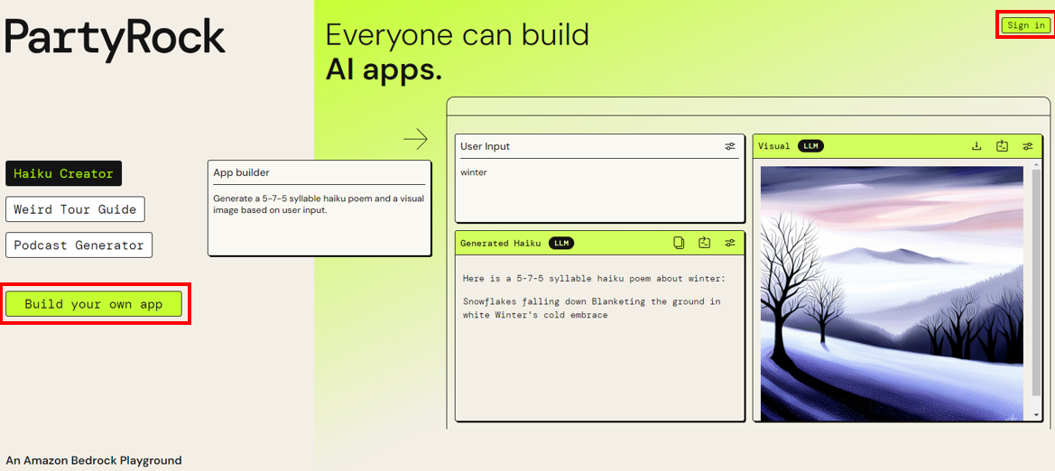 さて、そのような流れにのってAmazonBedrockを利用してアプリを生成、共有するサービス、PartyRockがAWSからリリースされました。 早速利用してみましょう。