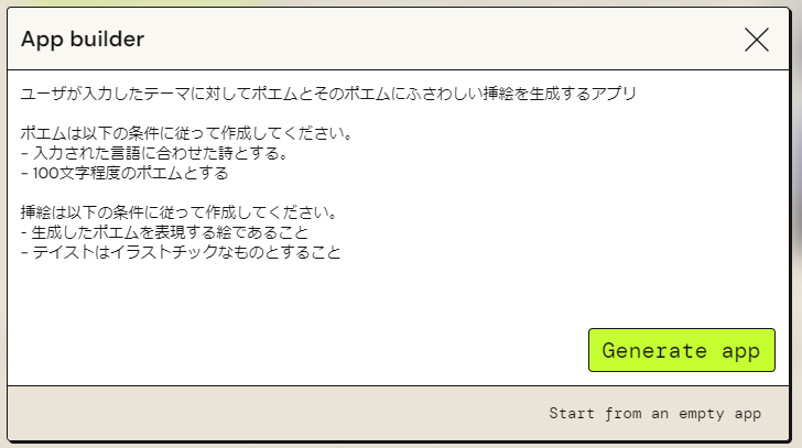 生成したいアプリの内容を入力、Generate appを押下し、しばらくたつとアプリケーションが生成され、以下のような画面が表示されます。