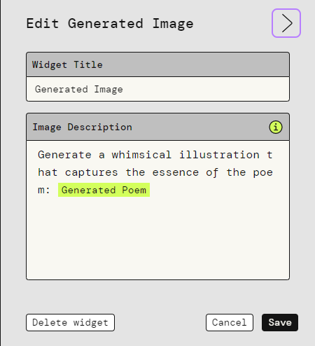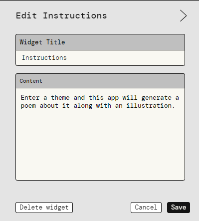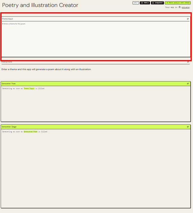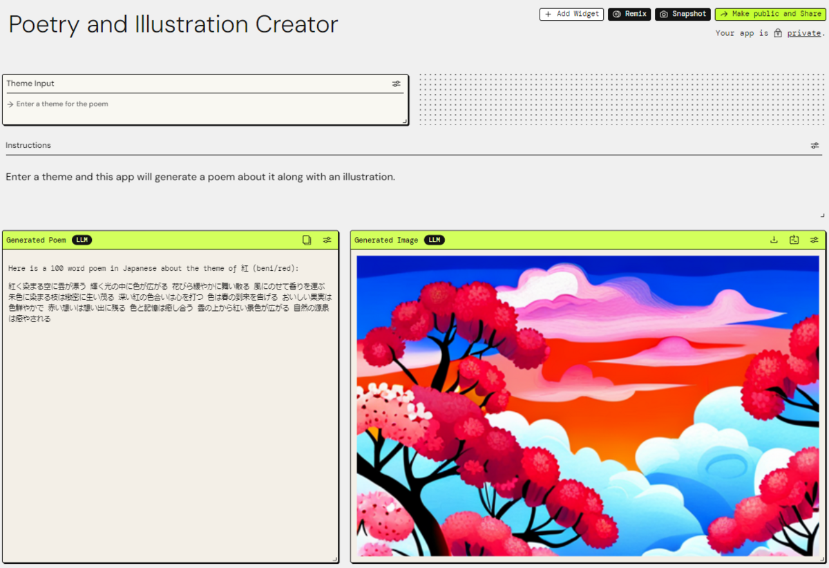 そしてその下部にある黄緑色のヘッダのウィジェットがそれぞれポエムと挿絵を生成する出力欄になります。