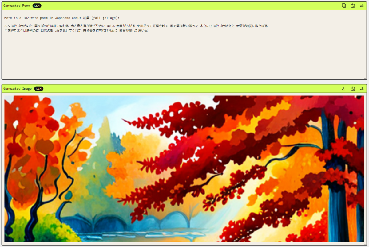 試しに「紅葉」をテーマにポエムと挿絵を生成してもらいましょう。