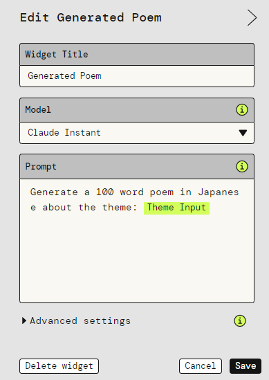 タイトル、テキスト生成モデル、プロンプト、モデルへのパラメータを設定できます。