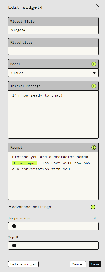 追加する際には、上部のAdd Widgetボタンから、削除はそれぞれのウィジェットの編集メニュー下部のDelete Widgetから実行できます。