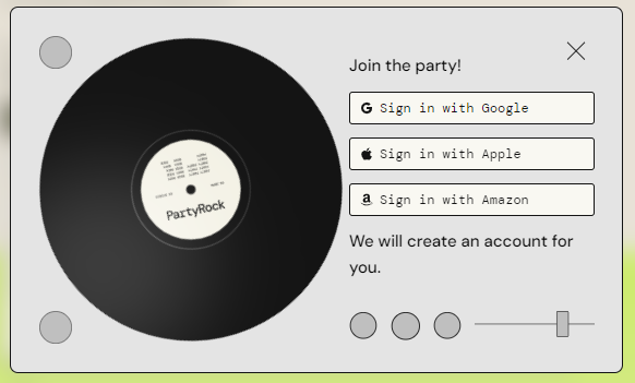PartyRockのサイトにアクセスし、Sign inボタンを押下するか、Build your own appを選択し、生成したいアプリの条件を入力後にアカウント作成ダイアログが表示されます。