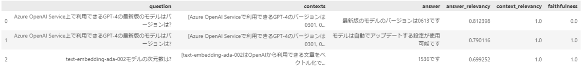 このようにto_pandas()を呼び出すことでDataFrameとして各QAごとの今回指定した3つの評価結果を得ることができます。