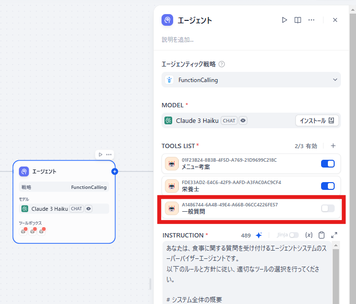 主となるチャットフローを作成し、こちらのエージェントノードのFunction Calling戦略を用いて、ツールの振り分け処理を定義します。