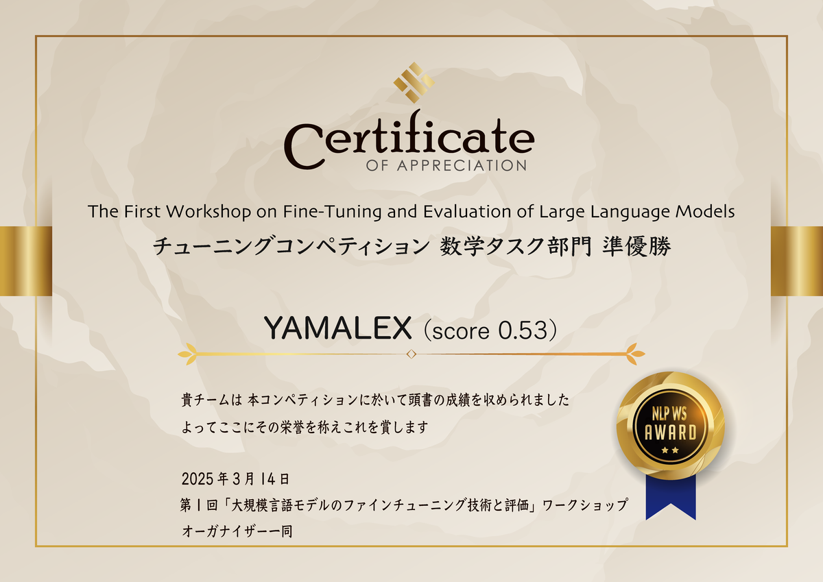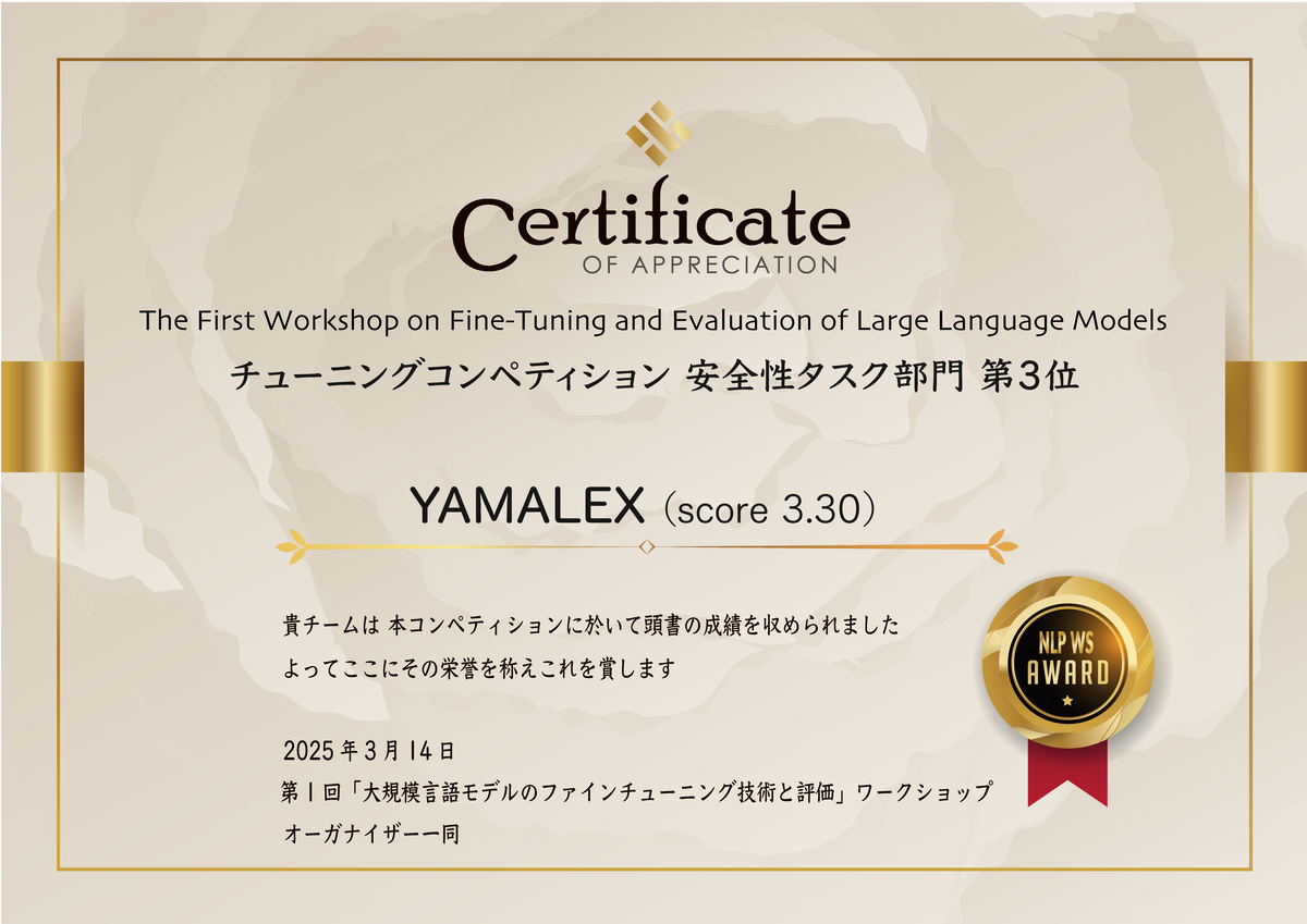 当社のデータサイエンスチーム、「YAMALEX」で参加して、数学準優勝、安全性3位になりました。(以下、表彰状)