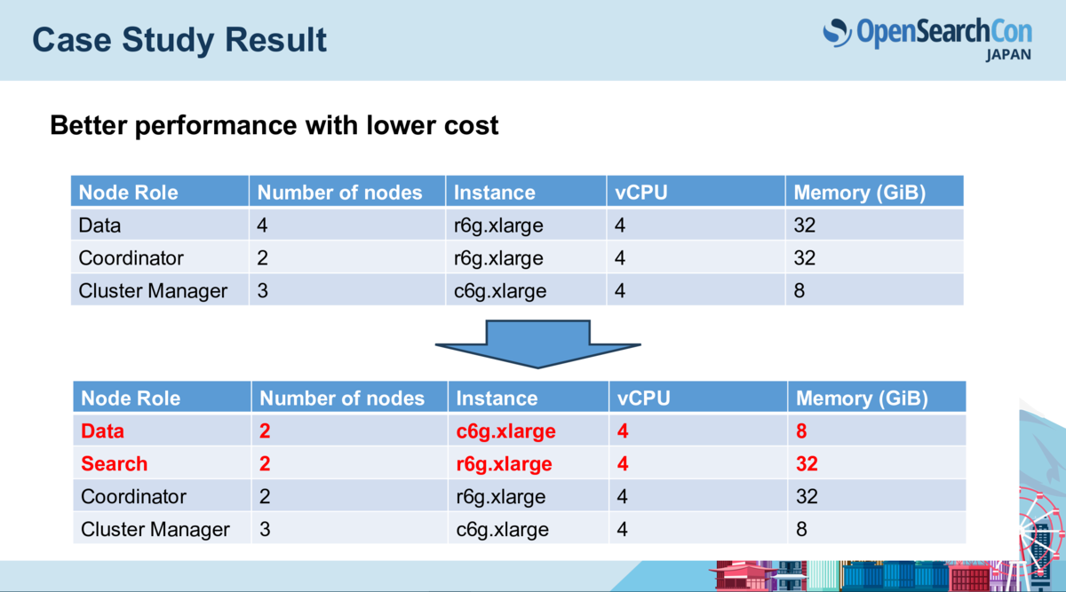 発表の中で示された例としては 32GiBのインスタンス4つを利用していたところ、そのうちの2台を 8GiB のインスタンスに変更して同トラフィックを捌く例などがありました。